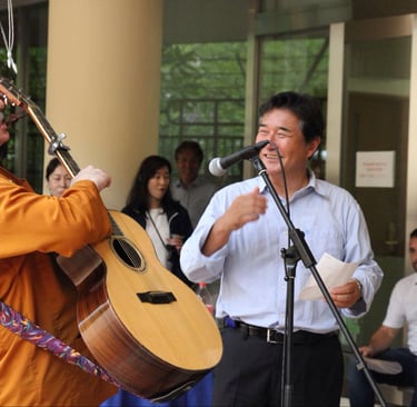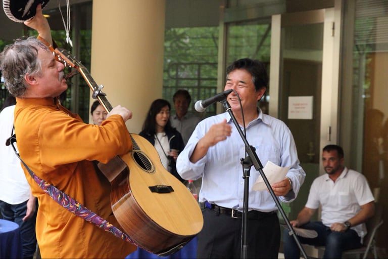 才能のあるケビン ブーシェイ氏は親切にもこのリユニオンのチームソングを歌ってくれました。彼は好意でUSJで数ヶ月ランチタイムに英語、日本語交換クラスを主催した素晴らしいチームメンバーです。彼は2001年の初期のUSJ建築メンバーであり、彼のプロジェクトは以下のコンテンツより見ることができます。